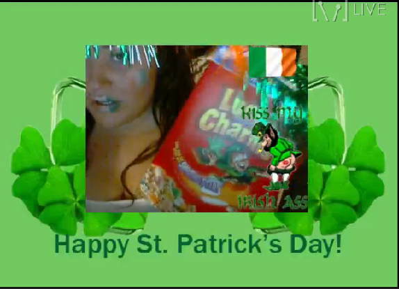 Bubbs with her wee bit bazookas has ensnared a Leprechaun whose search for a golden filled pot over the rainbow has lead his hands inside his wee bit trousers for Happy ST. Paddys Day.